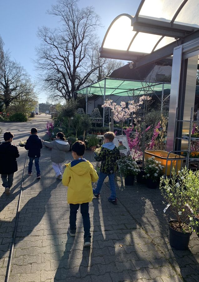 Eine klassenübergreifende Gruppe an Kindern der Stufe 1 besuchte zum Auftakt das benachbarte Gartencenter Jürgl und besorgte für die einzelnen Klassen ein paar Frühblüher. Narzisse, Hyazinthe, Tulpe, Schneeglöckchen - viele neue Wörter wurden gelernt.